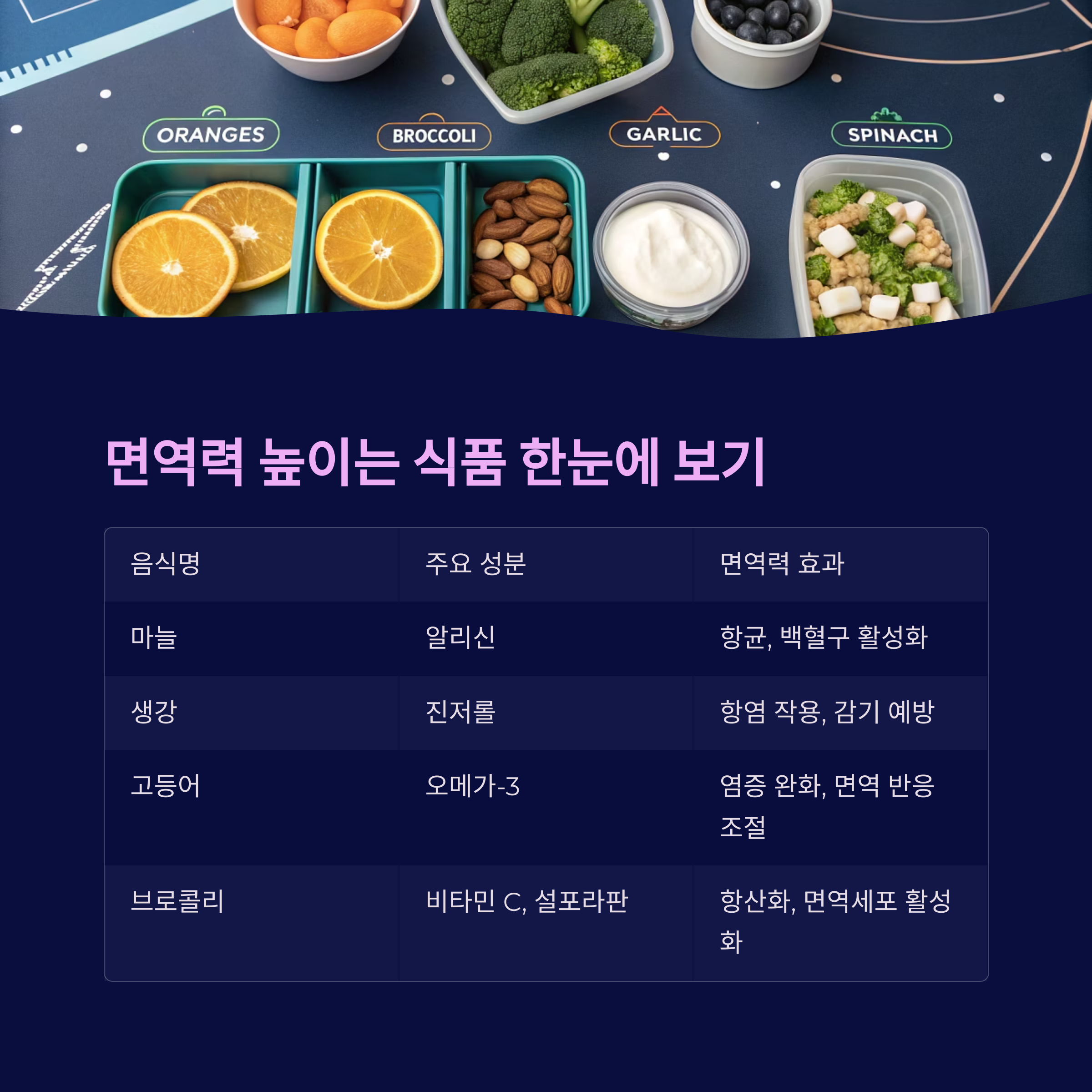 | 브로콜리 | 비타민 C, 설포라판 | 항산화, 면역세포 자극 |