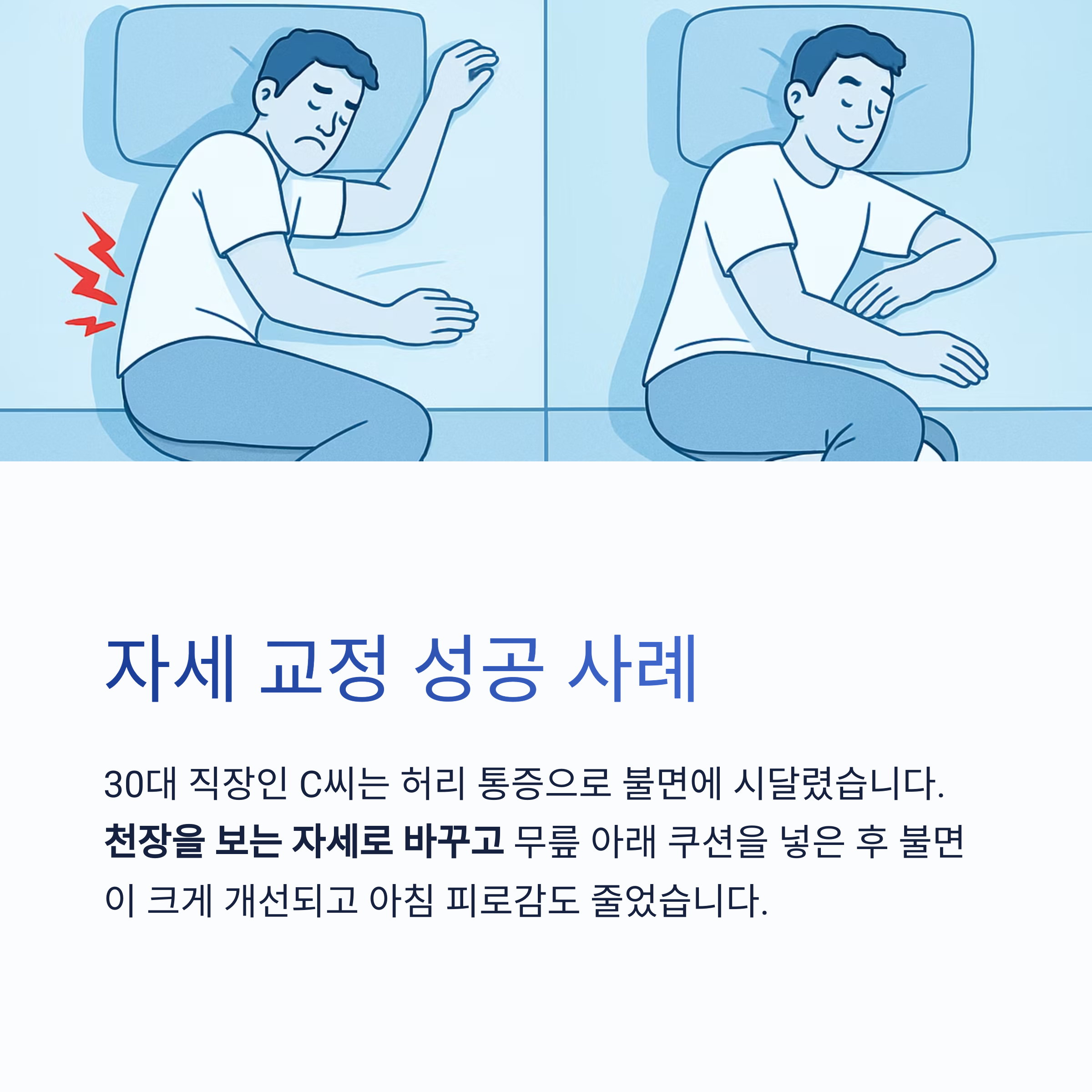수면 자세 하나 바꿨을 뿐인데, 수면의 질이 달라진 대표적인 사례입니다.