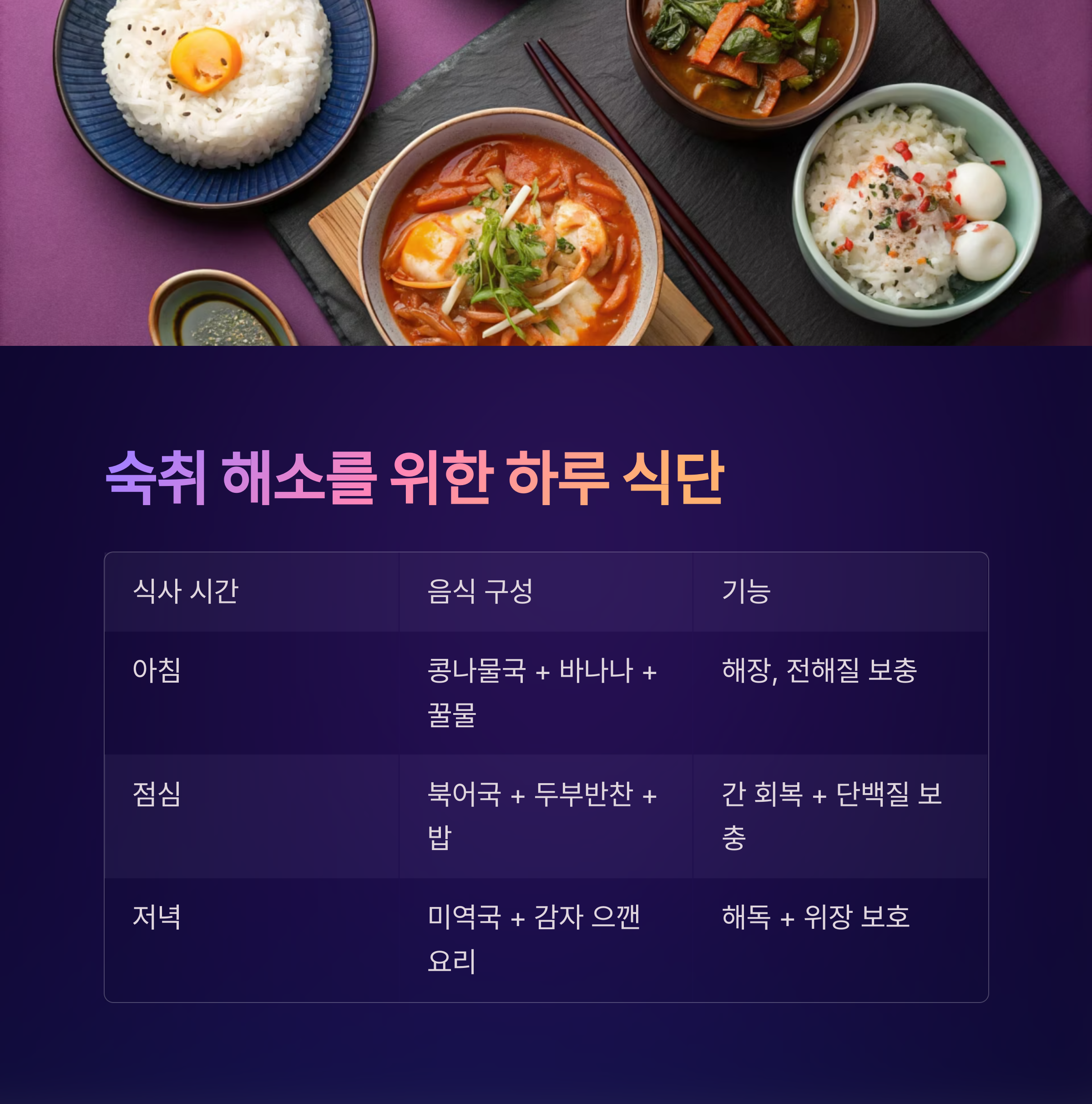 | 아침 | 콩나물국 + 바나나 + 꿀물 | 수분 보충과 해장 효과 |