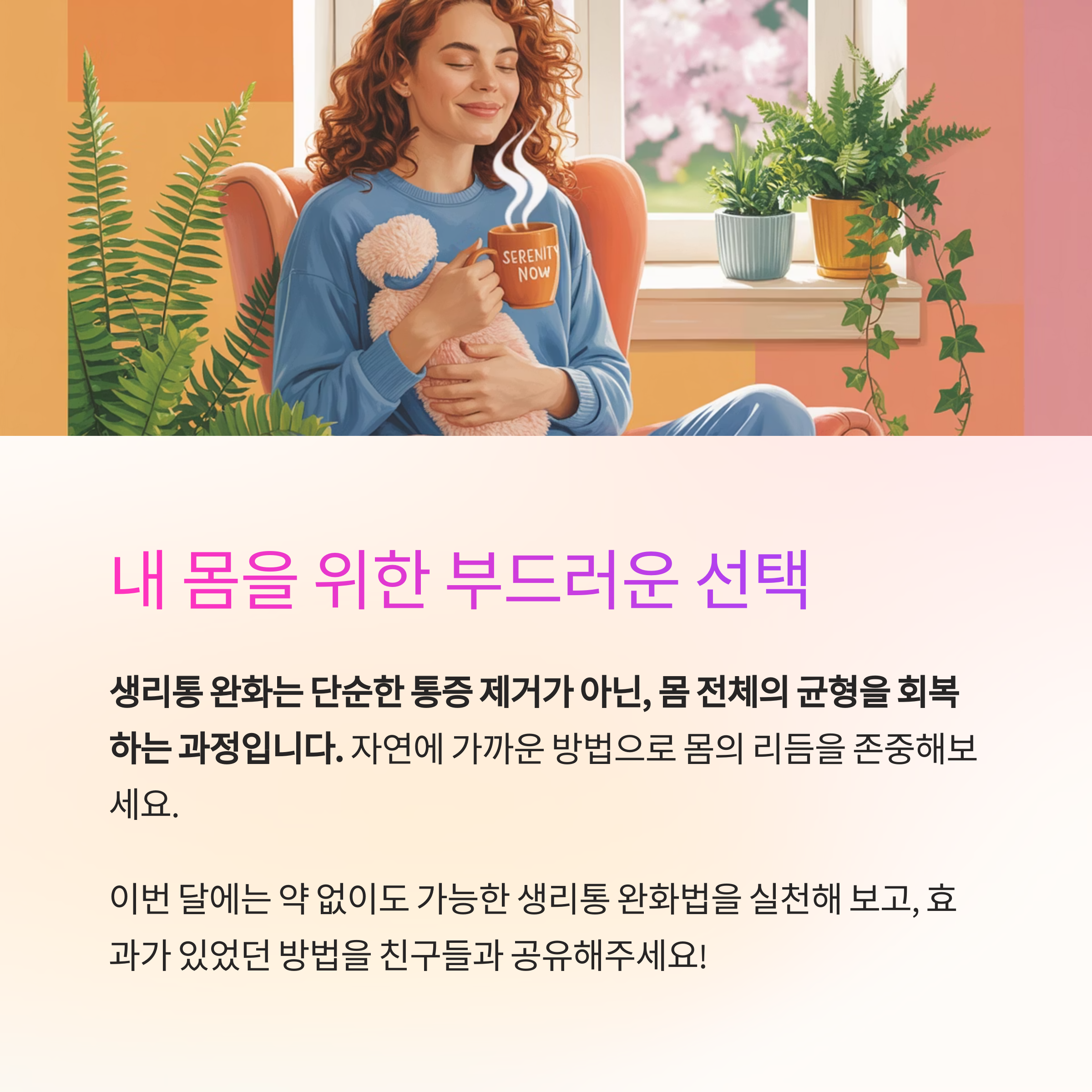 자연에서 온 재료들과 일상 속 작은 습관만으로도 생리통을 부드럽게 완화할 수 있습니다.