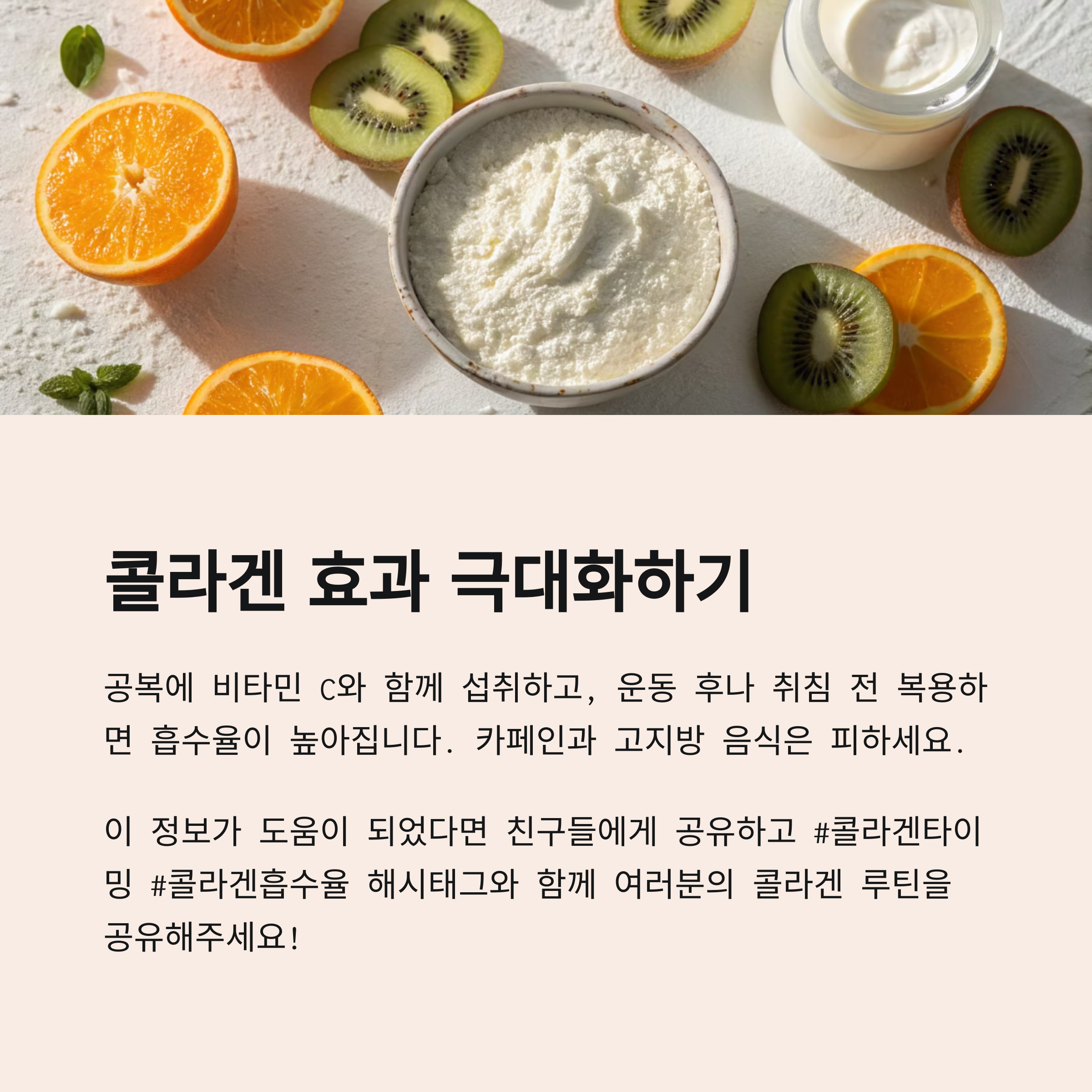콜라겐은 깨끗한 수분과 비타민 C 중심 식단과 함께 섭취하는 것이 좋습니다