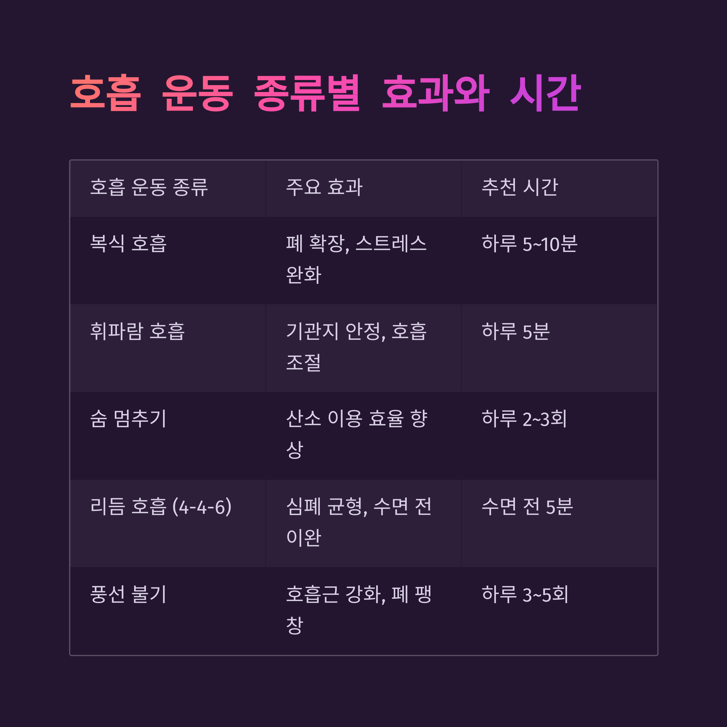 호흡 운동 종류 주요 효과 권장 시간