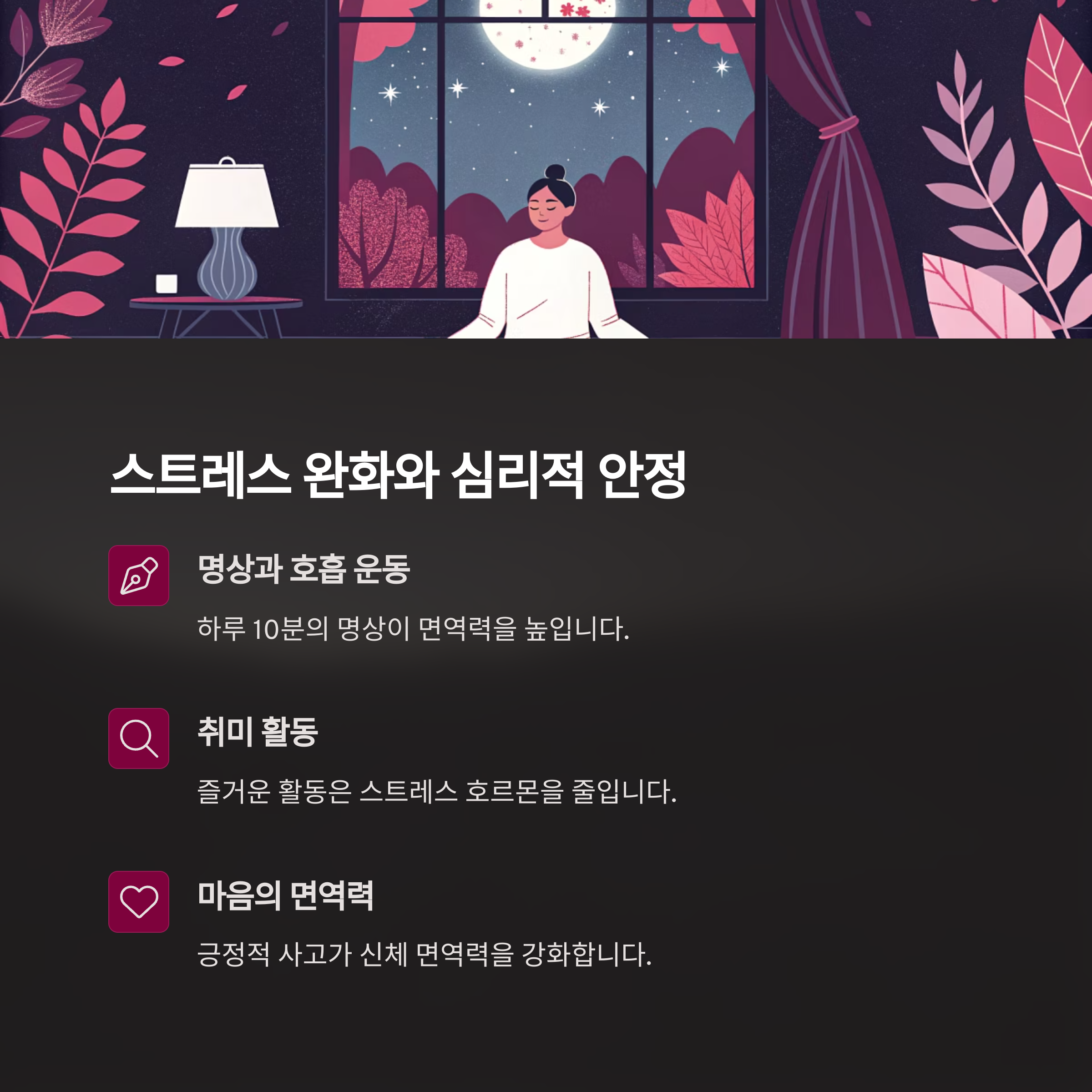 | 스트레스 완화 | 명상, 취미생활, 긍정적 사고 |